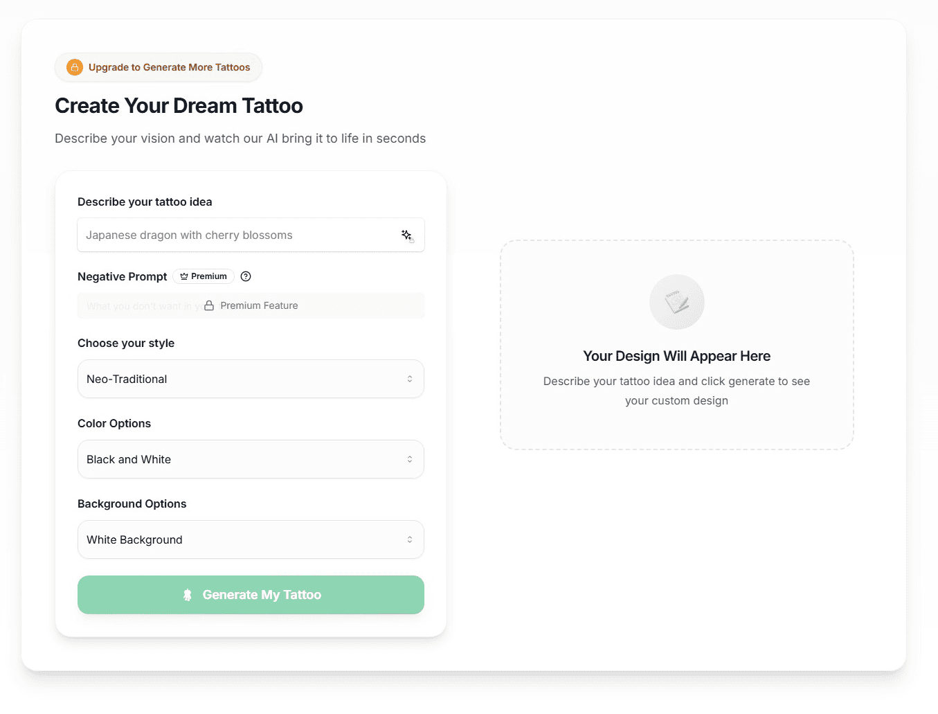 - AI Prompt Optimizer (Premium Feature): This feature helps us transform our basic ideas into detailed, optimized prompts that generate stunning tattoo designs. The AI automatically adds artistic elements and is Style-Aware to ensure better results.